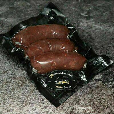 Unsere edle Ibérico-Morcilla im 3er Pack ist ein kulinarisches Statement – ein Beweis dafür, dass bei uns wirklich das gesamte Tier geschätzt und verarbeitet wird. Hergestellt und verfeinert mit Pankomehl und einem Schuss Sahne, entfaltet sie eine südlich-würzige Note, die Erinnerungen an mediterrane Genussmomente weckt. Ob pur oder auf knusprigem Weißbrot: ein ehrlicher Hochgenuss – ganz ohne Geschmacksverstärker, traditionell im Naturdarm gefüllt.